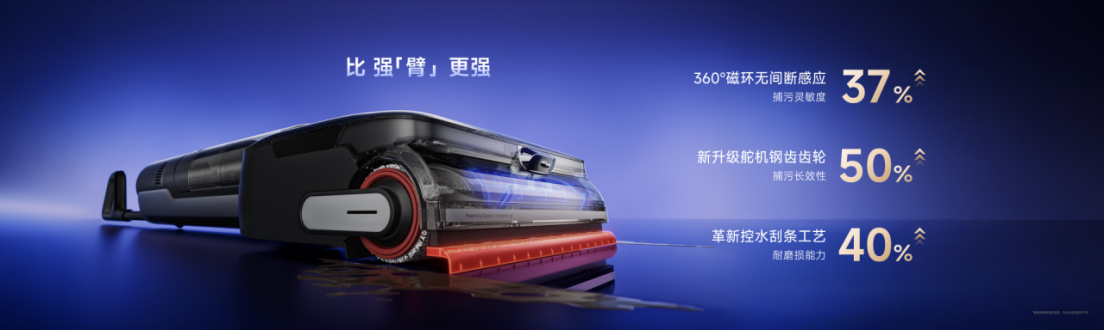 針對邊角、縫隙等深度清潔的難題,T50 Ultra洗地機搭載了追覓專利靈捕AI機械臂2.0。通過AI技術的精準感知,機械臂能夠實時發現并捕捉污漬,回拉時機械臂抵達邊緣自動下壓,迅速捕捉邊角的污漬。其微秒級的極速升降功能確保了水漬的即時清除,實現了“即擦即干”的高效清潔,達到了真正意義上的“0 貼邊、0 水漬”的清潔標準。與1.0技術相比,靈捕AI機械臂2.0在捕捉污漬的靈敏度、刮水的穩定性以及使用壽命上都有顯著提升,徹底解決清潔死角難題。